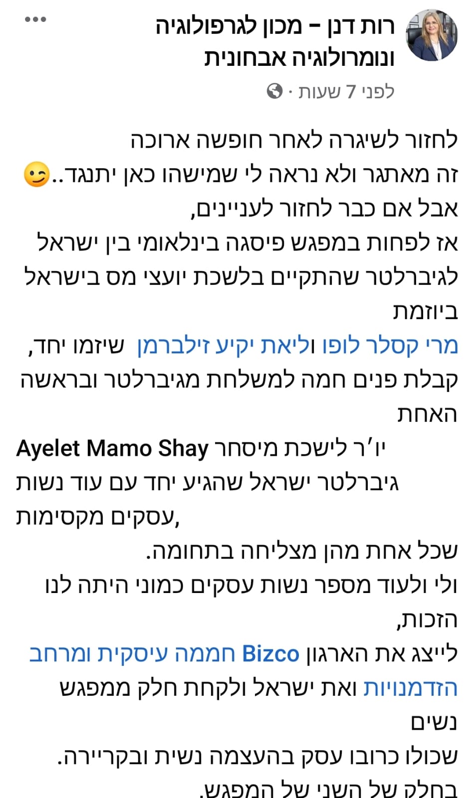 שיתוף בחוויות של איילת ממו שי ורות דנן מהמפגש הבינלאומי בין נשות ביזקו, נשות גיברלטר ונציגי לשכת יועצי המס בישראל